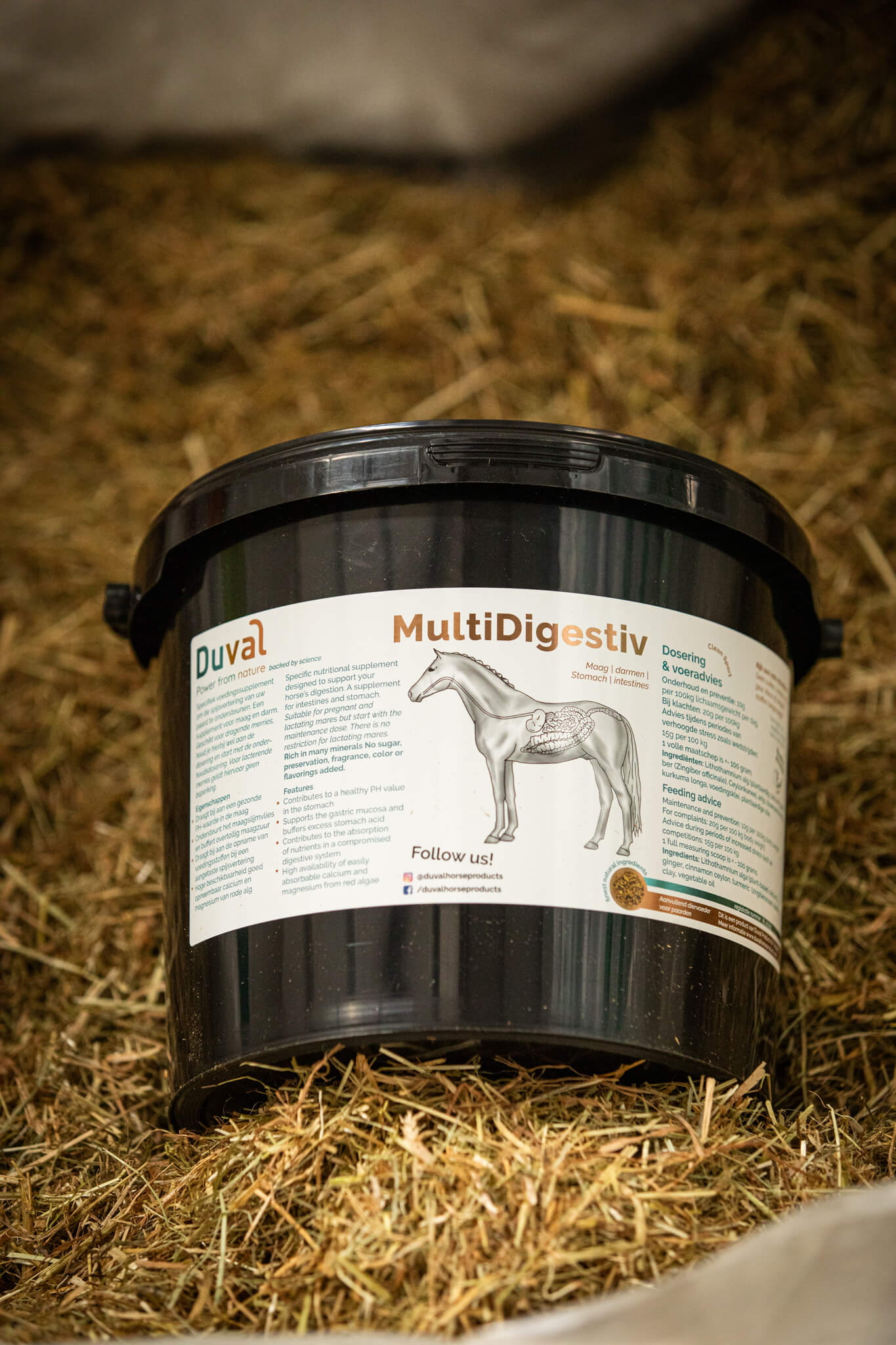 Duval MultiDigestiv is (preventief) voor het behoudt van een gezonde maag en darmen. Het is o.a. aanbevolen bij paarden die gevoelig zijn voor stress, maagzweren, verminderde eetlust tonen, gevoelig zijn voor koliek of onregelmatig mesten.